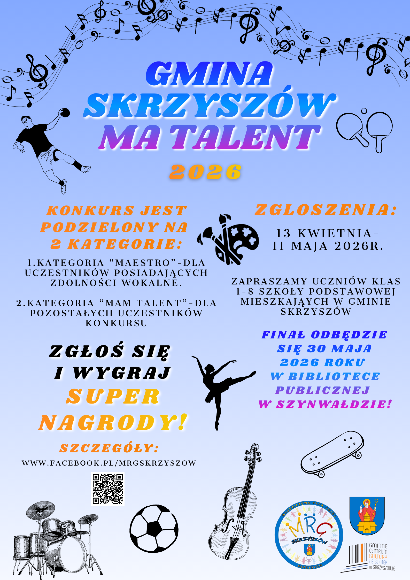 Ruszają zapisy do II edycji konkursu „Gmina Skrzyszów Ma Talent” organizowanego przez Młodzieżową Radę Gminy Skrzyszów. Konkurs został podzielony na dwie kategorie: Gminny Konkurs „Maestro” – dla do osób, które posiadają