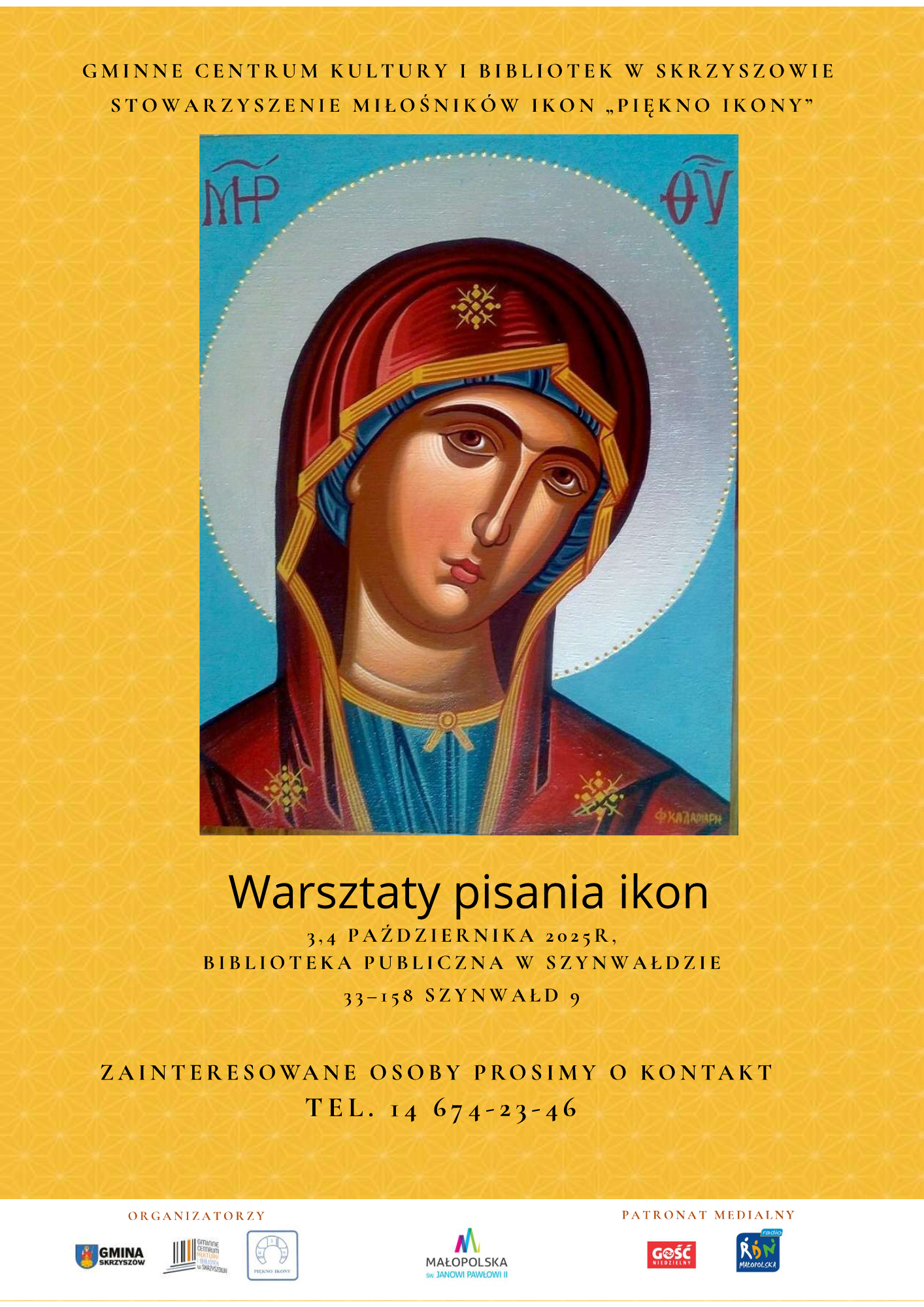 Już 3 i 4 października zapraszamy mieszkańców gminy Skrzyszów do udziału w warsztatach pisania ikon. W trakcie dwudniowego spotkania uczestnicy zostaną wprowadzeni w tematykę ikonopisarstwa. Dowiedzą się m.in. czym jest ikona i na czym polega jej fenomen.