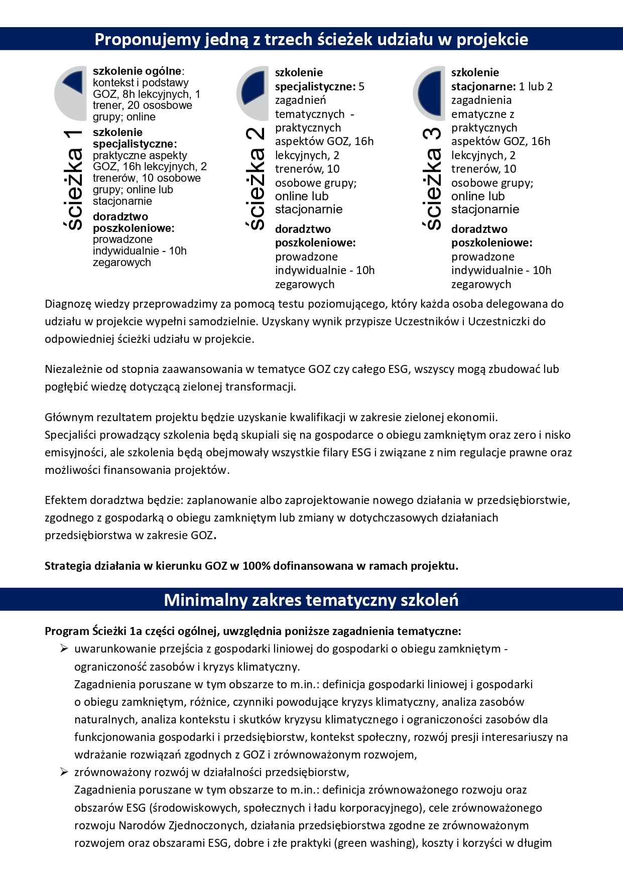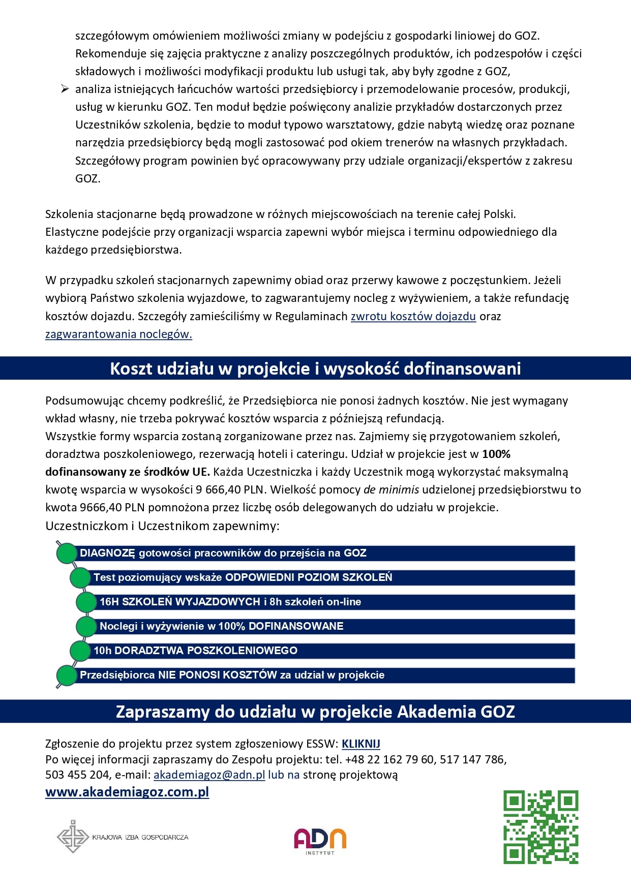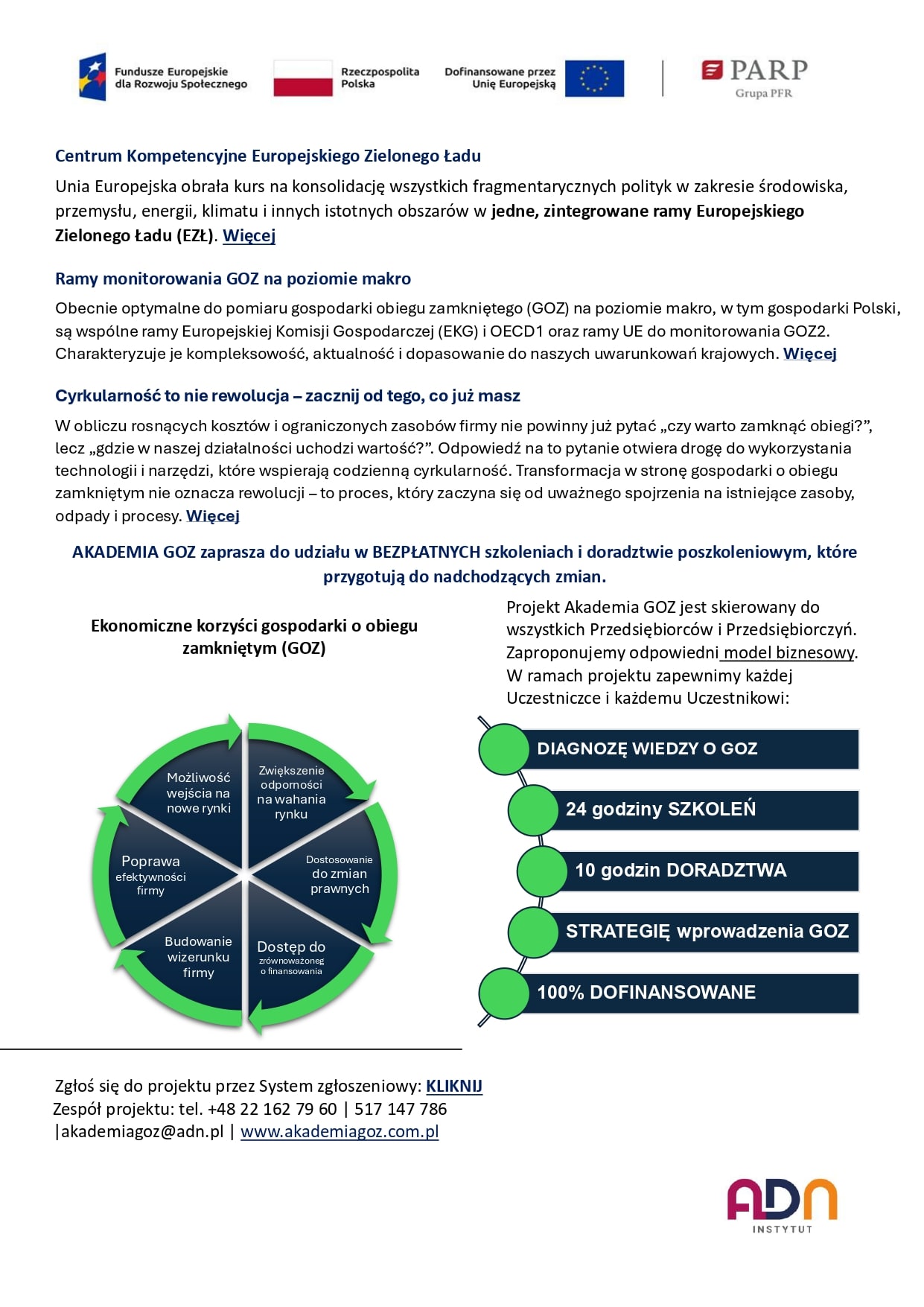 Krajowa Izba Gospodarcza oraz Instytut ADN sp. z o. o. sp. k. zaprasza do udziału w projekcie „Akademia GOZ”. Projekt jest skierowany do przedsiębiorstw, które mogą skorzystać z 16 godzin szkolenia specjalistycznego, 8 godzin szkolenia ogólnego i 10 godzin indywidualnego doradztwa po szkoleniowego z tematyki Gospodarki o Obiegu Zamkniętym. GOZ to jeden z trzech filarów ESG - Environmental, Social and Governance, czyli Środowisko, Społeczeństwo i Zarządzanie, które ma ogromny wpływ na lepsze wyniki w raportowaniu poza finansowym.