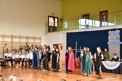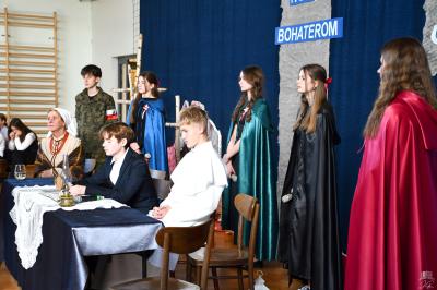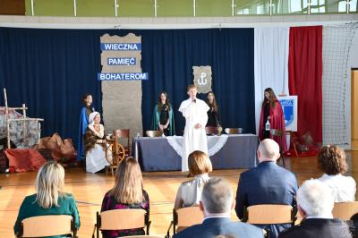 Uczniowie zaprezentowali okolicznościowe przedstawienie. Ich występ przeniósł widzów w trudną, wojenną przeszłość. Przewodnikami po niej były Parki, boginie ludzkich losów.