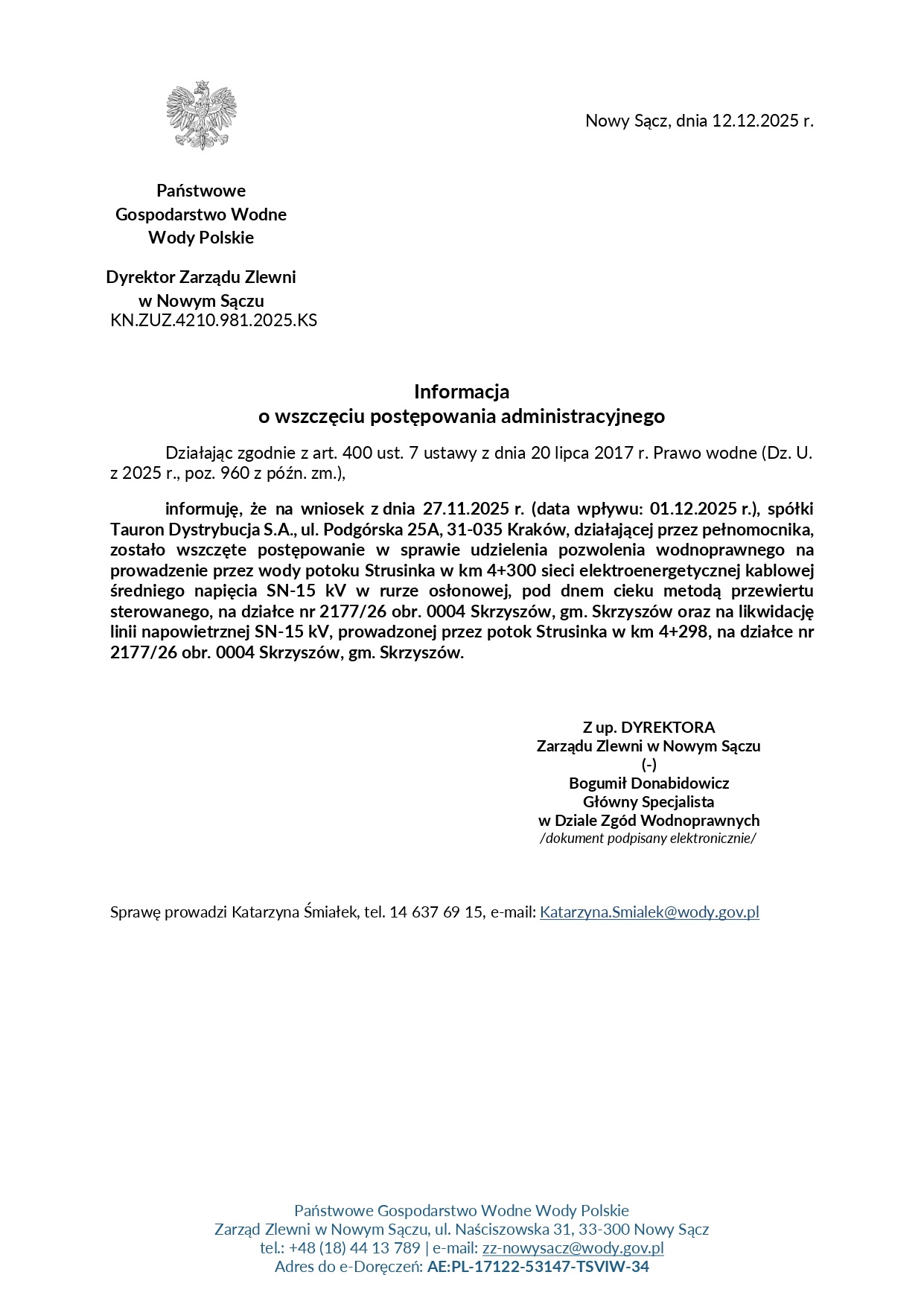 Informacja Dyrektora Zarządu Zlewni w Nowym Sączu