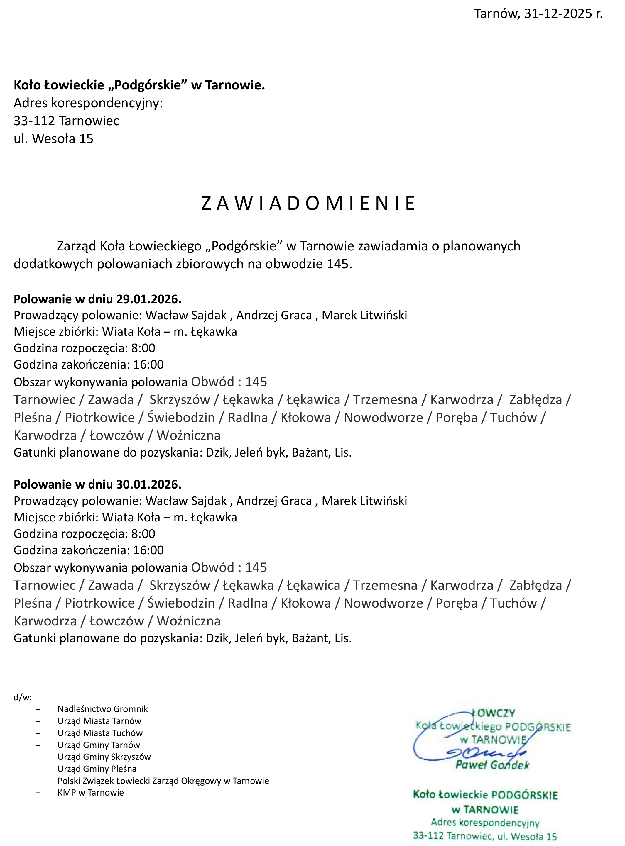 Zawiadomienie o planowanych dodatkowych polowaniach zbiorowych na obwodzie 145 08.01.2026 8:45 Treść Facebook Twitter Email Drukuj