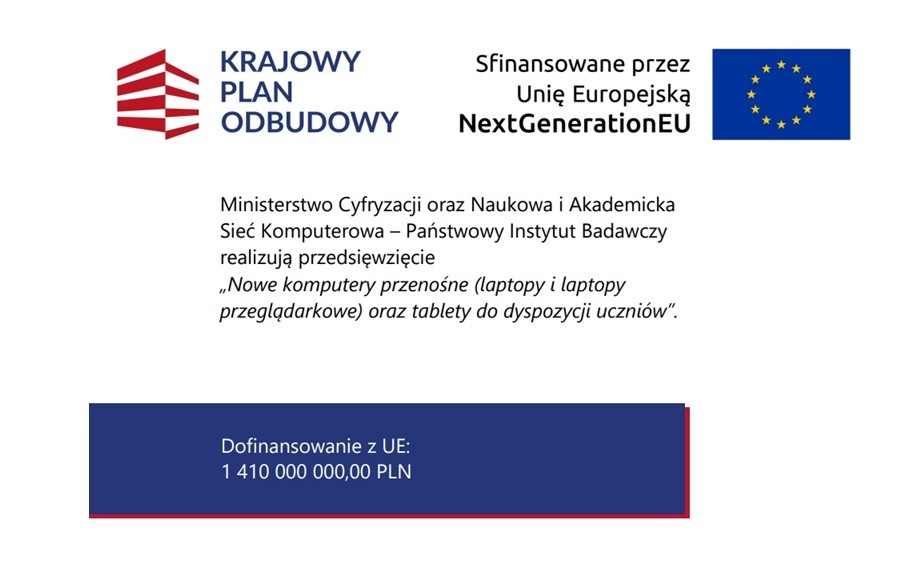 Zakup i przekazanie sprzętu komputerowego do szkół odbywa się przy wsparciu finansowym Unii Europejskiej w ramach Krajowego Planu Odbudowy. Łączna kwota środków unijnych przeznaczonych na realizację tego działania dla wszystkich beneficjentów w kraju wynosi 1 410 000 000,00 zł.
