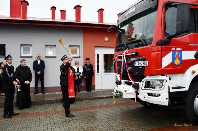 Poświęcenia pojazdu ratowniczo-gaśniczego dokonali ks. Kamil Wróbel kapelan powiatowy strażaków oraz ks. Wojciech Jurkowski proboszcz parafii w Ładnej.