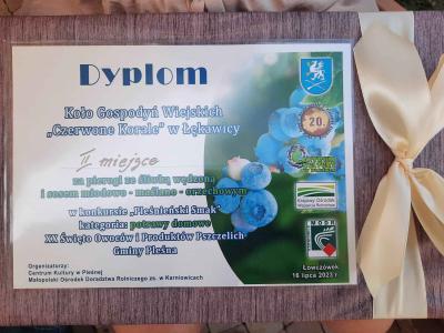 W niedzielę 16 lipca 2023 r. na boisku sportowym w Łowczówku odbyło się jubileuszowe XX Święto Owoców i Produktów Pszczelich Gminy Pleśna. W wydarzeniu udział wzięli przedstawiciele Koła Gospodyń Wiejskich "Czerwone Korale" w Łękawicy. W trakcie wydarzenia istniała możliwość skosztowania różnych potraw, wypieków, miodów, nalewek oraz win. Degustacjom towarzyszyły konkursy. Członkowie Koła z Łękawicy na to wydarzenie przygotowali bukiet owocowo-warzywny składający się m.in. z kapusty pekińskiej, rzodkiewki oraz pora. W konkursie „Pleśniński Smak” w kategorii "potrawy domowe" KGW z Łekawicy zaprezentowało pierogi ze śliwką wędzoną i sosem miodowo–maślano-orzechowym. Pierogi zrobiły wrażenie na jury, dzięki czemu "Czerwone Korale" zajęło 2 miejsce. Członkom Koła gratulujemy wysokiego wyniku w konkursie i życzymy powodzenia w kolejnych przedsięwzięciach!