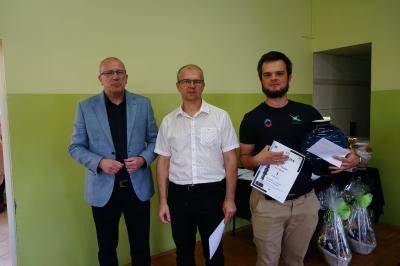 Uroczystego wręczenia nagród dokonali: Paweł Kasperek Sędzia Klasy Międzynarodowej oraz Robert Wadycki Dyrektor Szkoły Podstawowej nr 1 im. Jana Pawła II.