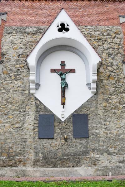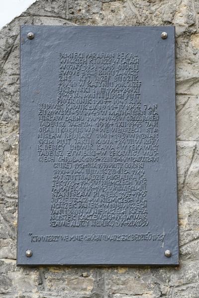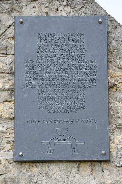 Na zewnętrznej ścianie prezbiterium, znajdują się dwie metalowe tablice, poświęcone mieszkańcom Łękawicy. Na jednej napis: „Pamięci zmarłych proboszczów parafii Łękawica oraz tutejszych rodaków kapłanów i zakonnic”, na drugiej „Pamięci parafian łękawickich, którzy w latach wojny 1939-1945 oddali swoje życie Bogu za Ojczyznę”, poniżej napisów wymienione nazwiska i daty.